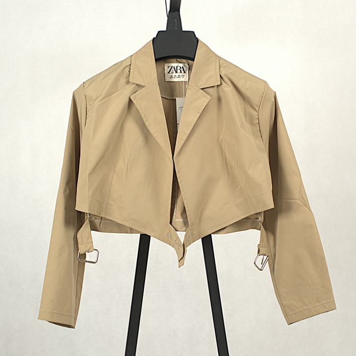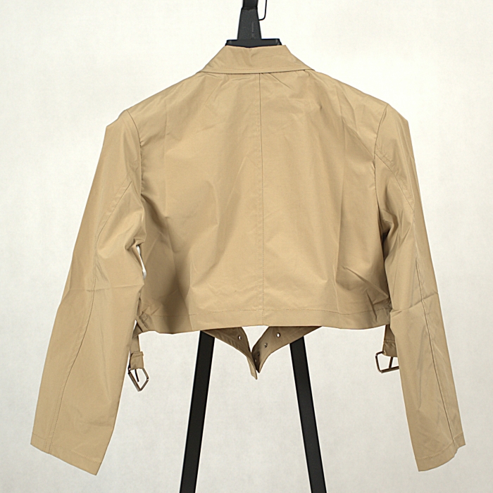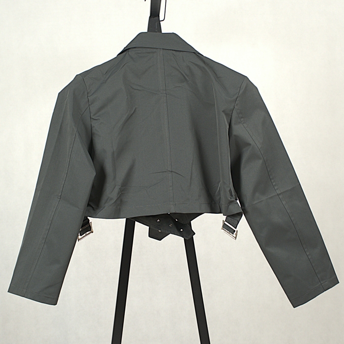 جزئیات کمر: یکی از ویژگیهای شاخص این کت، وجود کمربند سگکدار در لبه پایینی است. همچنین در طرفین کت، بندهای قابل تنظیم با سگکهای فلزی دیده میشود که به استایل آن حالتی "پانک" یا "نظامی مدرن" میبخشد.