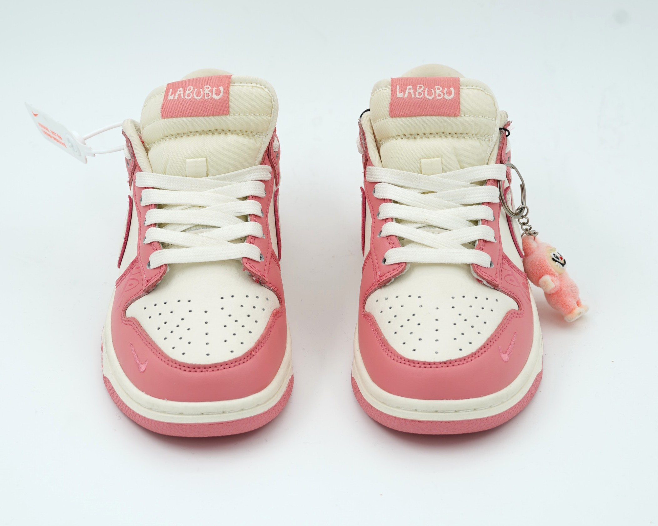 این مدل با ترکیب رنگ صورتی و سفید، طراحی فانتزی و اکسسوری عروسکی Labubu، انتخابی خاص برای استایل خیابونی و دخترانه محسوب میشه. الهام گرفته از مدل محبوب Nike Dunk Low که هم راحتی بالایی داره و هم ظاهر ترندی.